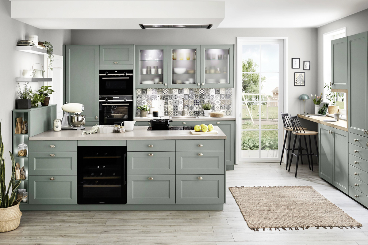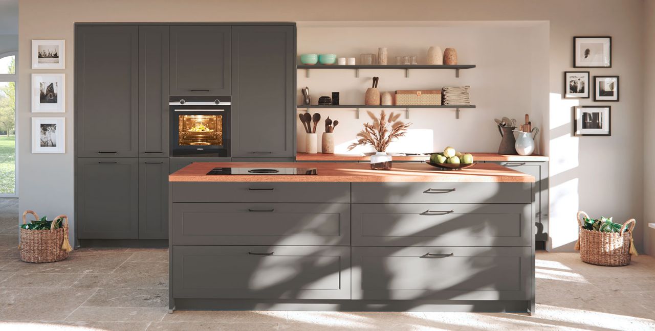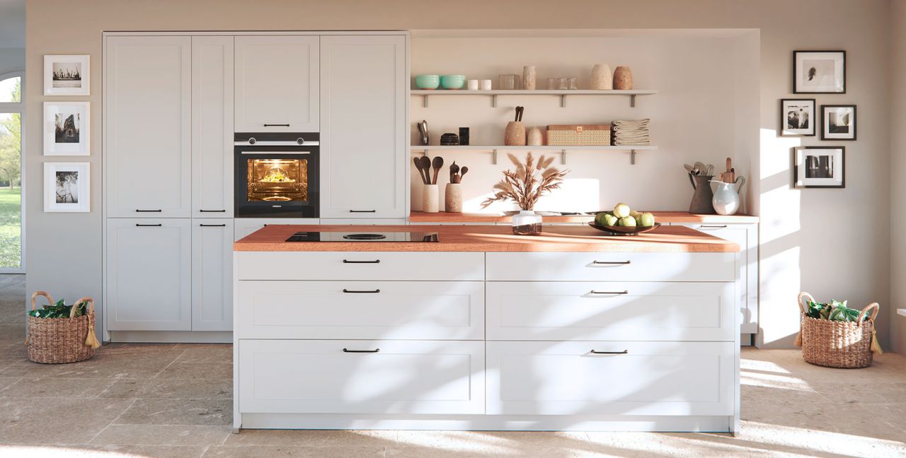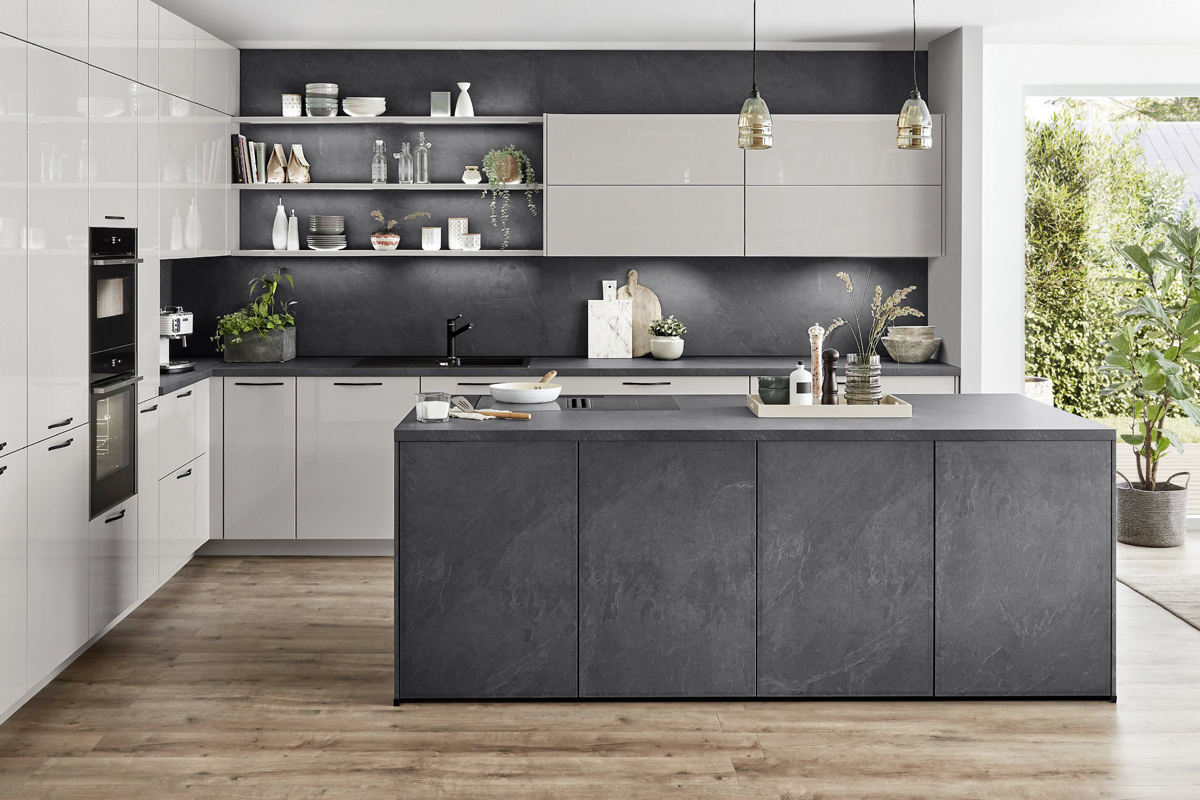 Inclusief RVS-inbouwoven Siemens HB510ABR1 Energieklasse A, keramische kookplaat met inductie en werkbladafzuiging (circulatielucht) Bora GP4U, koelkast Laurus LKG88E Energieklasse E, volledig geïntegreerde vaatwasmachine Laurus LSV60-4 Energieklasse E, RVS-inbouwspoelbak Rodi Okio Line 85 Deep, XL-kasten, onderkasten met frontladen, wandborden, servieskasten.